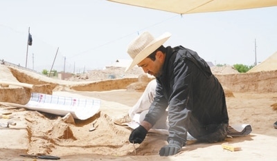 5月,比龍?jiān)谖挥跒跗潉e克斯坦南部城市拜松的拉巴特遺址進(jìn)行考古挖掘。 孫和筱攝