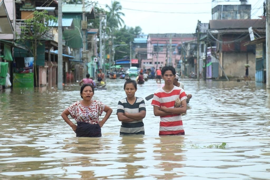 2023年8月12日,人們在緬甸勃固鎮(zhèn)被水淹沒的道路上涉水前行。新華社發(fā)(苗覺梭攝)
