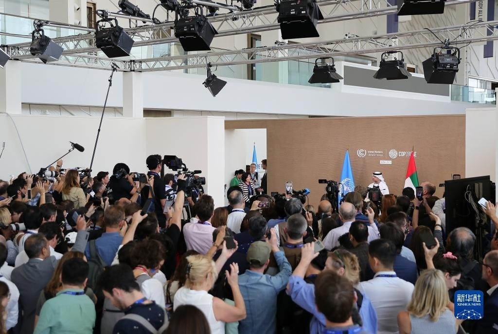 12月12日,在阿聯(lián)酋迪拜,參會(huì)人員走在聯(lián)合國(guó)氣候變化迪拜大會(huì)會(huì)場(chǎng)內(nèi)。新華社記者 王東震 攝