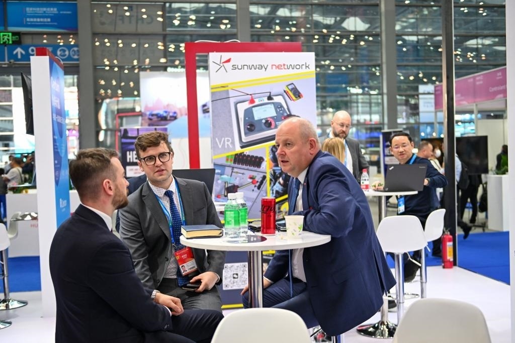 11月15日,在第二十五屆高交會(huì)上,客商在波蘭展臺(tái)交流。新華社記者 毛思倩 攝