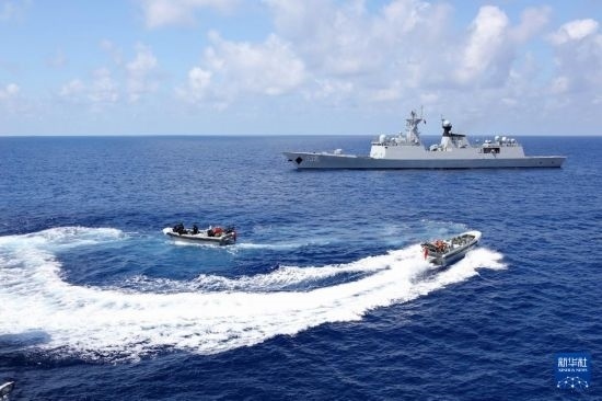 中國海軍第45批護航編隊烏魯木齊艦、東平湖艦為中國漁船護航(2023年10月20日攝)。新華社發(fā)(王遠方攝)