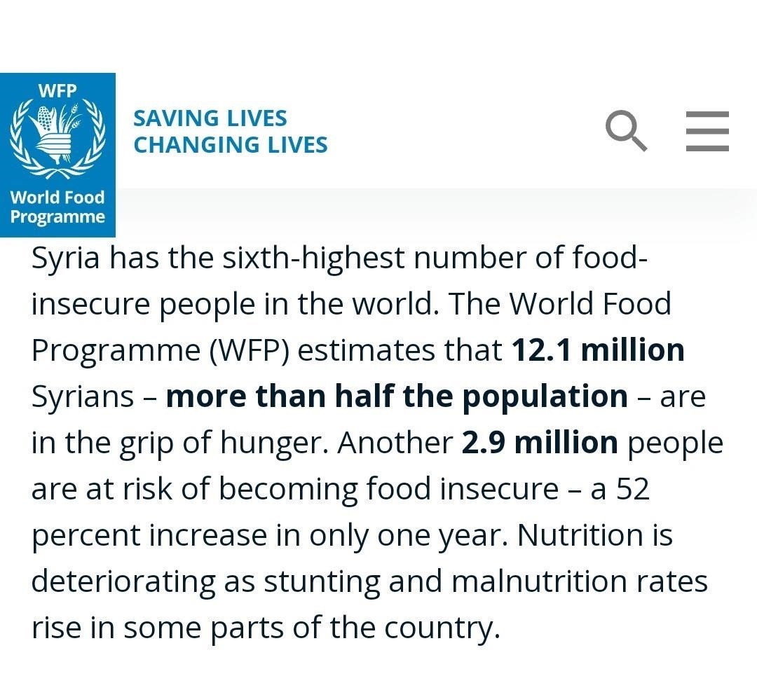 盡管敘政府仍保有部分農(nóng)田的控制權(quán),但西方制裁對金融和貿(mào)易的限制使得化肥、種子、農(nóng)藥、飼料、農(nóng)機(jī)零配件等無法進(jìn)入敘利亞境內(nèi)。歷史上的敘利亞是小麥出口國,而如今的政府卻不得不使用非常寶貴的外匯來進(jìn)口大量小麥,財(cái)政負(fù)擔(dān)因此而大大增加。即便如此,世界糧食計(jì)劃署的數(shù)據(jù)仍顯示,敘利亞境內(nèi)約有一半以上人口面臨糧食不安全,240萬人面臨著嚴(yán)重的營養(yǎng)危機(jī)。