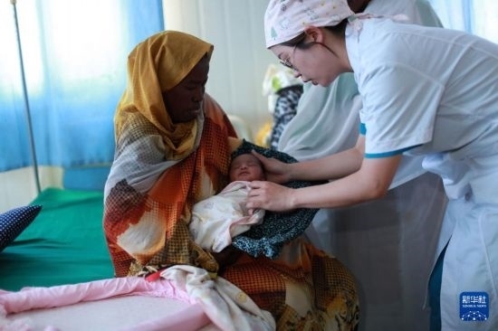 2023年2月22日,中國(guó)援蘇丹醫(yī)療隊(duì)婦產(chǎn)科醫(yī)生劉韡在蘇丹阿布?xì)W舍醫(yī)院的病房為一名新生兒做檢查。新華社發(fā)(中國(guó)援蘇丹醫(yī)療隊(duì)供圖)