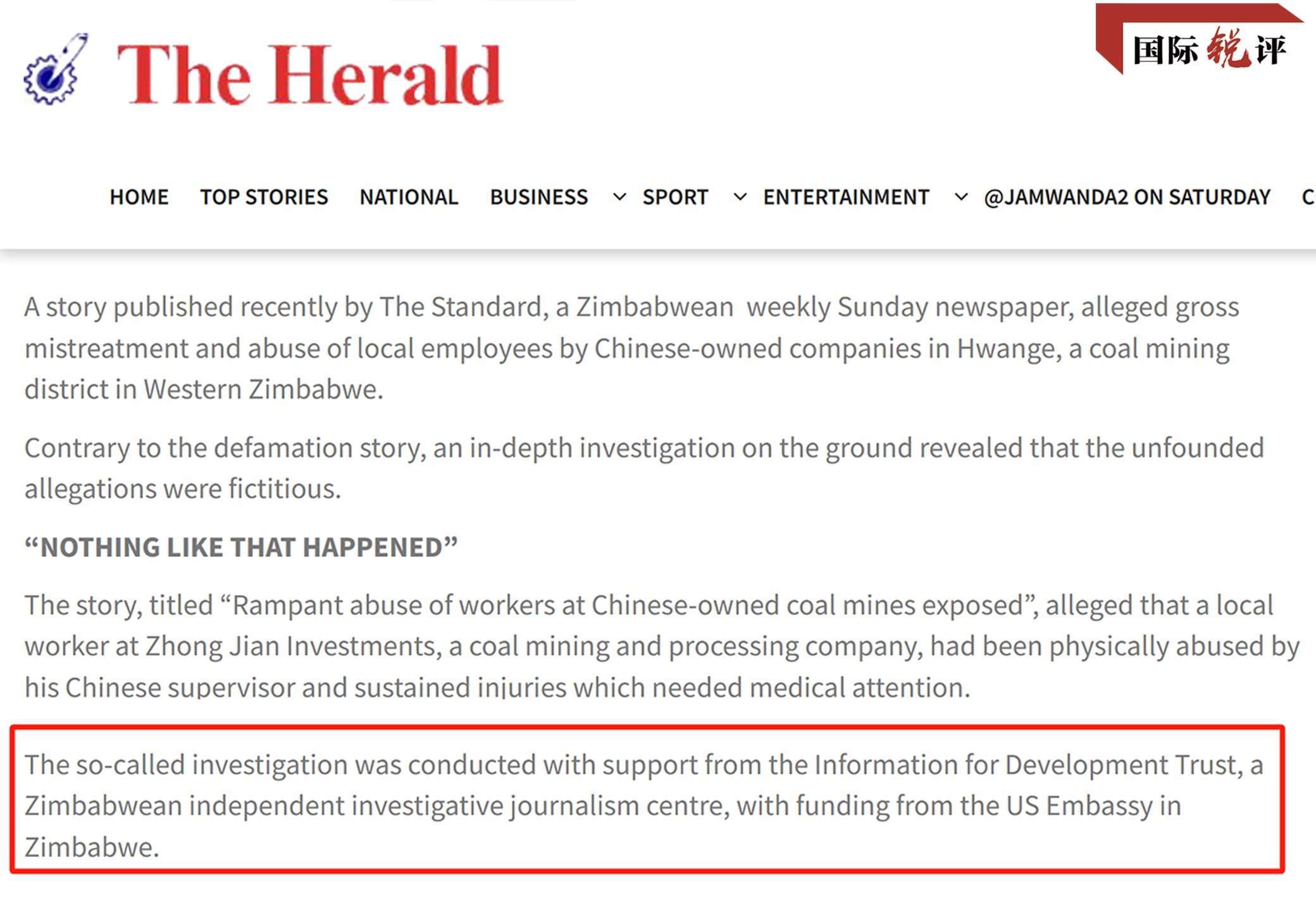 2022年5月,津巴布韋媒體《標準報》發(fā)布了一篇報道,污蔑中國礦企虐待當地員工,稱這名員工“受傷送醫(yī),還被解雇了”。這家媒體稱,報道是和津巴布韋一個名叫“信息促進發(fā)展信托基金(IDT)”的機構合作完成的。然而很快,津巴布韋《先驅報》就發(fā)文,用大量事實證明,這名員工只是和中方員工發(fā)生了小口角,并沒有被毆打,也沒有被解雇。