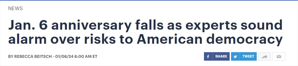 這項(xiàng)民調(diào)結(jié)果公布之時(shí),正值“國(guó)會(huì)山騷亂”事件三周年之際,美國(guó)也迎來新的選舉年?!秶?guó)會(huì)山報(bào)》網(wǎng)站在6日的報(bào)道中再次提到,目前美國(guó)出現(xiàn)了一系列與民主狀況有關(guān)的令人不安的跡象。
