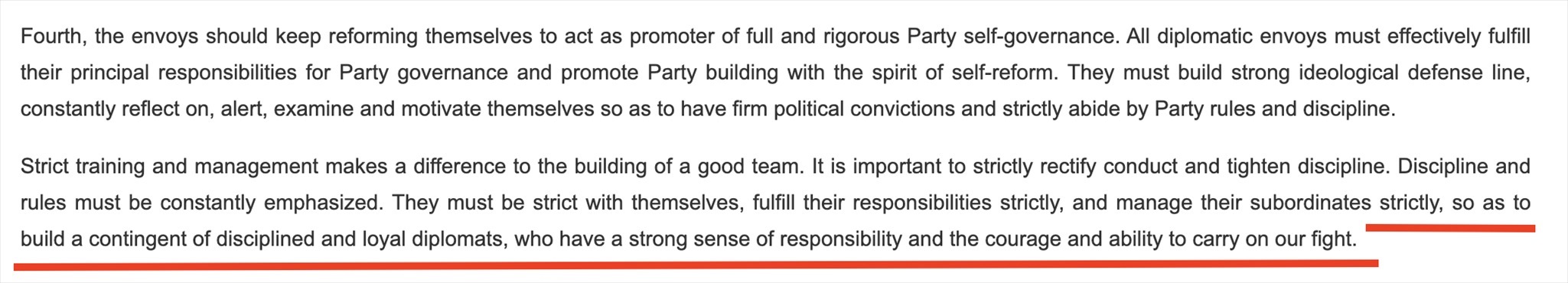 “鐵軍”一詞常見于政府文件或領(lǐng)導(dǎo)人講話,更多的是強調(diào)工作作風(fēng)和紀律。在近年來中國領(lǐng)導(dǎo)人講話中,曾多次出現(xiàn)“紀律監(jiān)察鐵軍”“生態(tài)環(huán)境保護鐵軍”等表述。中國領(lǐng)導(dǎo)人在接見與會使節(jié)時的講話中說:“打造一支對黨忠誠、勇于擔(dān)當(dāng)、敢斗善斗、紀律嚴明的外交鐵軍。”外交部網(wǎng)站對這句話的英文翻譯(見下圖)同樣強調(diào)外交隊伍的紀律、責(zé)任和勇氣。作為通行做法,世界各國對本國外交人員都有著很高的紀律要求。