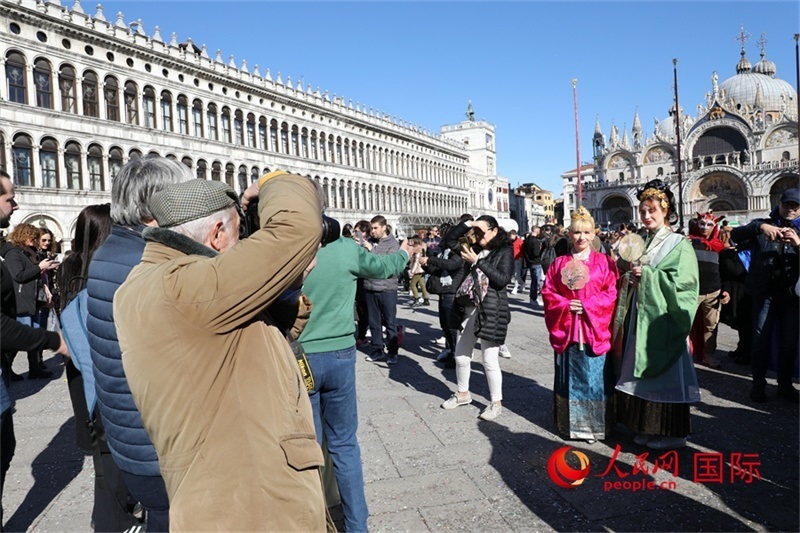據介紹,這次參與巡游的服飾,是從蘇州絲綢博物館郵寄過來的,有融合蘇州絲綢元素的清麗典雅的傳統(tǒng)服飾,也有端莊大氣的宋錦新中裝。上午十點半,由22名中意志愿者組成的漢服巡游隊伍從威大孔院向圣馬可廣場行進。志愿者們身著不同朝代的漢服并配以精致的妝發(fā),成為威尼斯街巷中一道靚麗的風景線,吸引了許多沿途民眾的目光。