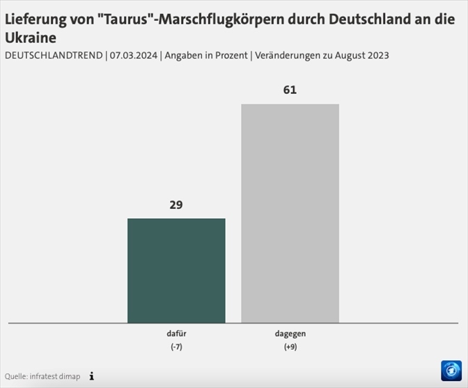 根據(jù)德國電視一臺當?shù)貢r間7日公布的最新“德國趨勢”民調(diào),在“竊聽門”事件發(fā)生后,61%的德國民眾反對向烏克蘭提供“金牛座”巡航導彈,較去年8月的民調(diào)結(jié)果增長了9%;支持的民眾數(shù)量減少了7%,占比僅為29%。民調(diào)還顯示,70%的受訪者擔心間諜活動增加,67%的人擔心德國對此缺乏準備,還有62%的民眾擔心德國可能會直接卷入戰(zhàn)爭。