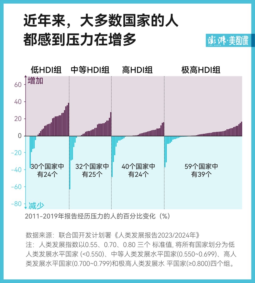 但其中低人類發(fā)展水平組、中人類發(fā)展水平組中,有約 80% 的國家個人壓力上升,且上升幅度較大,而高人類發(fā)展水平組和極高人類發(fā)展水平組的個人壓力上升幅度相對較小,這意味著欠發(fā)達國家的居民將面臨更大的壓力。