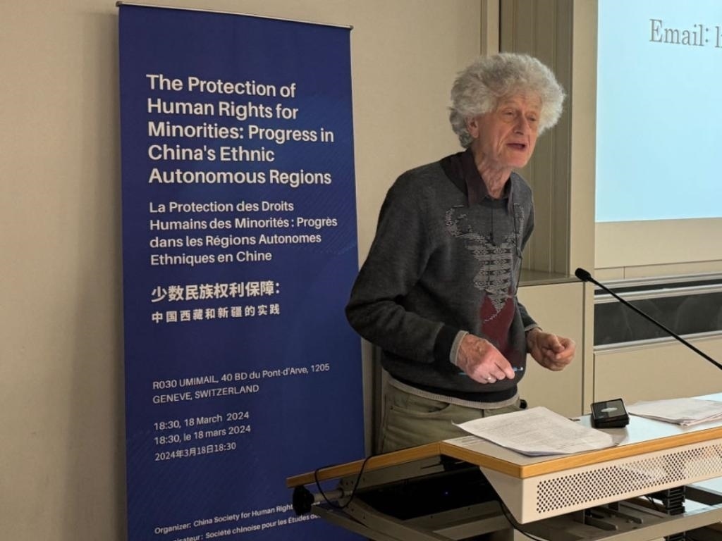 ?3月18日,由中國人權(quán)研究會主辦的“少數(shù)民族權(quán)利保障:中國西藏和新疆實踐”主題講座在瑞士日內(nèi)瓦舉行。圖為比利時知名藏學(xué)家安德烈·拉克魯瓦在講座上發(fā)言。新華社記者石松攝