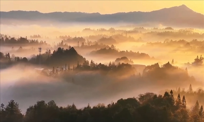 近日,在烏蒙山深處的云南省鹽津縣出現(xiàn)日出云海景觀。輕紗薄霧彌漫于山巒之間,宛如一幅日出版《千里江山圖》。
