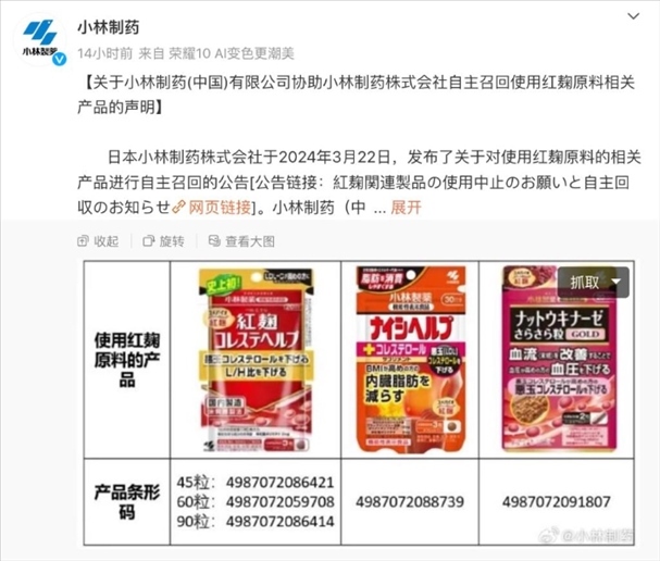 由于小林制藥生產(chǎn)的紅曲原料超過80%出售給其他公司,不少民眾開始擔(dān)憂是否已服用了含有問題成分的其他公司產(chǎn)品。社交媒體上一些網(wǎng)友留言表示,“紅曲色素也讓人不安”“暫時(shí)避開含紅曲的食品”等。一些生產(chǎn)商急忙和小林制藥撇清關(guān)系,聲明本公司生產(chǎn)和銷售的產(chǎn)品完全沒用到小林制藥的紅曲原料。
