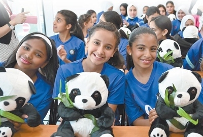 2023年9月17日,在科威特哈瓦利省的科威特中國文化中心,學習漢語的孩子們與熊貓玩具合影。阿薩德攝(新華社發(fā))
