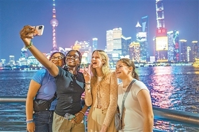 在上海外灘,馬斯卡廷中學(xué)學(xué)生拍照留念。王 初攝(人民視覺)