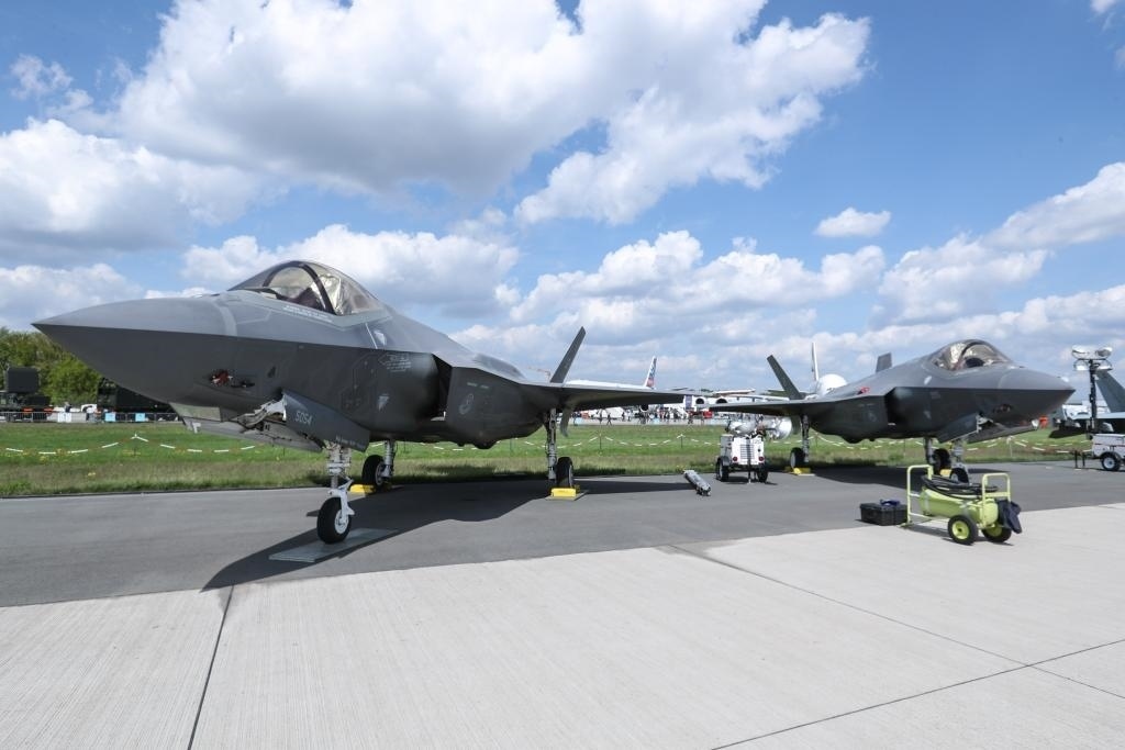 ?這是2018年4月27日在德國柏林國際航空航天展上拍攝的“F-35”型戰(zhàn)機。新華社記者單宇琦攝