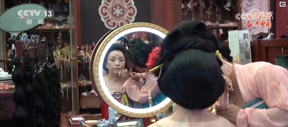 一抹柳葉眉,一頭貴妃髻,在胡芯銀的巧手之下,不到40分鐘的時(shí)間,一個(gè)“楊貴妃”的妝造就完成了,胡芯銀還專(zhuān)門(mén)在發(fā)髻上加上了古代飾物“步搖”。