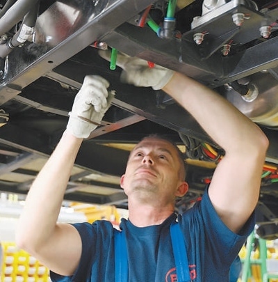 初夏時(shí)節(jié),多瑙河畔綠意盎然。在比亞迪匈牙利電動(dòng)大巴工廠的合裝車間,車間主任阿爾蓋·伊姆雷正在和工人們一起組裝大巴,這幾輛大巴訂單分別來自德國(guó)和希臘?!拔覀兊碾妱?dòng)大巴性能優(yōu)異,充電兩小時(shí)就可續(xù)航400公里,很受市場(chǎng)歡迎?!币聊防渍f。