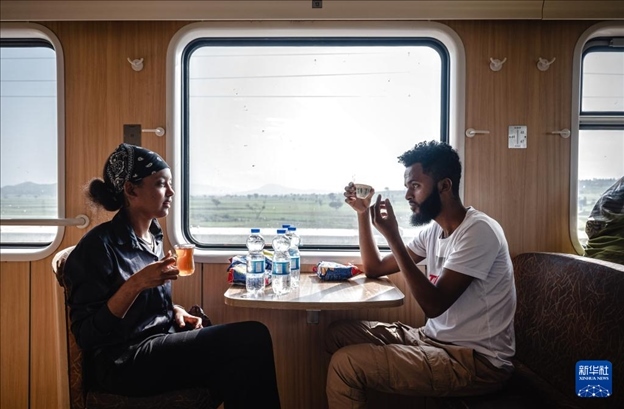 2023年9月9日,乘客在亞吉鐵路列車(chē)的餐車(chē)內(nèi)交談。新華社記者 王冠森 攝