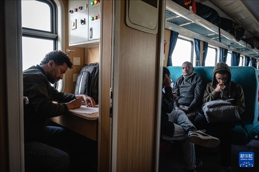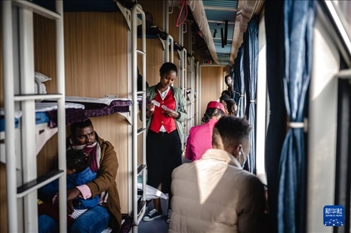 2023年9月9日,列車(chē)員在亞吉鐵路列車(chē)的車(chē)廂內(nèi)查票。新華社記者 王冠森 攝