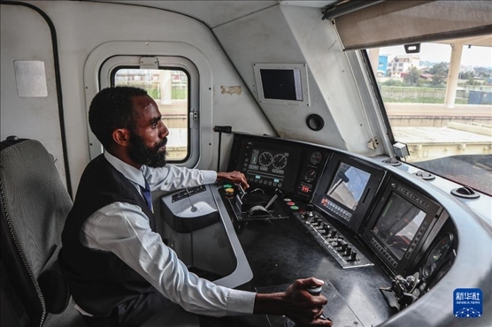 ?2024年5月10日,埃塞俄比亞火車(chē)司機(jī)在亞吉鐵路列車(chē)的駕駛室里工作。新華社記者 劉方強(qiáng) 攝