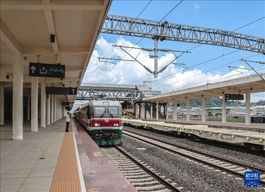 ?2024年5月10日,一輛列車(chē)駛?cè)氚H肀葋喪锥紒喌乃箒嗀惏偷睦蓟疖?chē)站。新華社記者 劉方強(qiáng) 攝