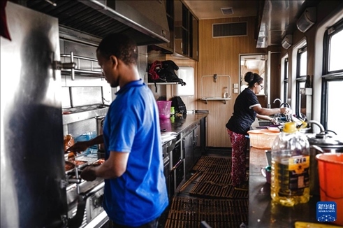 2023年9月9日,工作人員在亞吉鐵路列車(chē)上準(zhǔn)備餐食。新華社記者 王冠森 攝