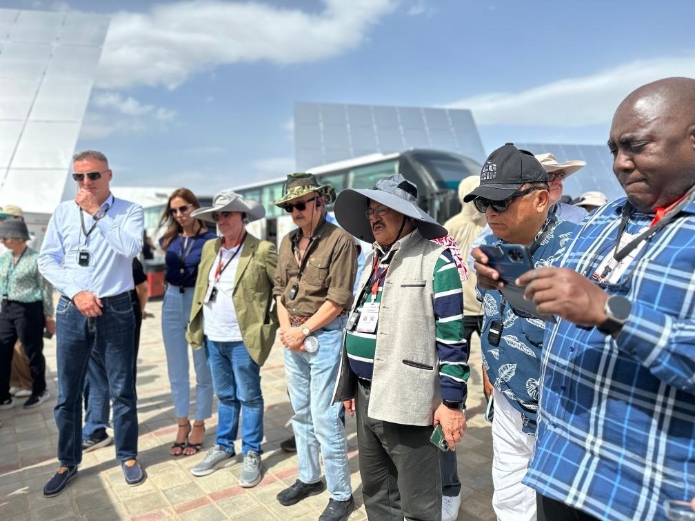 外交官們參觀首航高科敦煌100兆瓦熔鹽塔式光熱電站。新華社記者張文靜 攝