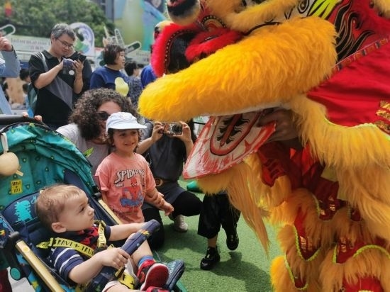 6月9日,端午小長(zhǎng)假第二天,在上海金橋的一處商業(yè)中心里,外國(guó)小朋友近距離觀看傳統(tǒng)舞獅。新華社記者 陳愛平 攝