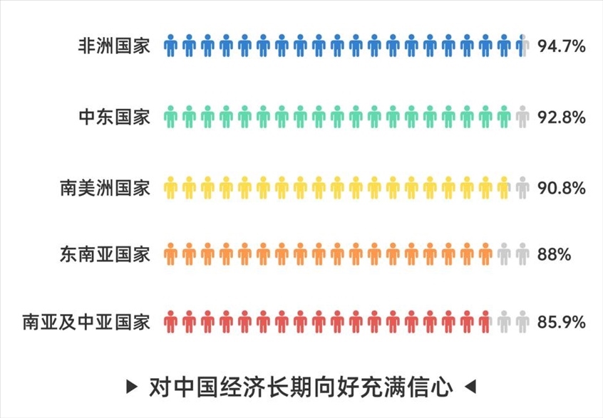 此外,81.3%的受訪者對于中國經(jīng)濟長期向好充滿信心,較去年上升7.1個百分點,認同度排在前五位的分別是非洲國家受訪者(94.7%)、中東國家受訪者(92.8%)、南美洲國家受訪者(90.8%)、東南亞國家受訪者(88%)和南亞及中亞國家受訪者(85.9%)。