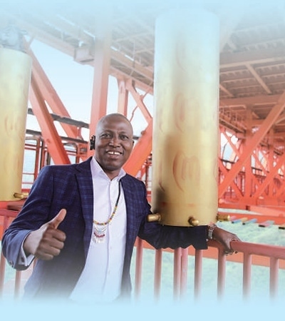 在位于安順市的壩陵河大橋,尼日利亞駐上??傤I(lǐng)事館商務專員哈桑在觀光步道中央拍照留念。
