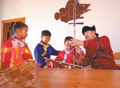 哈拉新村村民在教當(dāng)?shù)睾⒆友葑鄠鹘y(tǒng)樂器。齊齊哈爾大學(xué)孟加拉國籍留學(xué)生 衣睿實攝“在哈拉新村,我看到四弦琴造型的村口大門、魚叉狀的路燈,還有整整齊齊的‘介字房’……這里獨特的民族文化、濃郁的鄉(xiāng)土風(fēng)情,給我留下了深刻印象。當(dāng)?shù)丶缺A魝鹘y(tǒng)的達斡爾族人文特征,又開發(fā)文化體驗館、民族特色美食等現(xiàn)代旅游資源,重視文化保護和傳承的做法值得借鑒?!?/p>