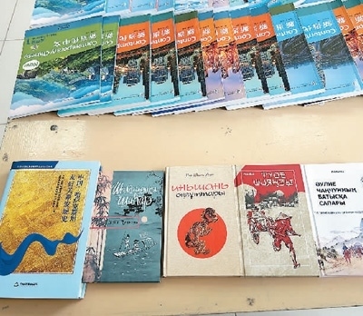 在孔子學院文化活動室桌面上,擺著幾本用哈薩克語翻譯的中國書籍,《邊城》《駱駝祥子》《長春真人西游記》《陰山汪古》等等。