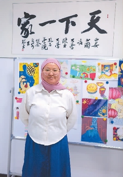 學生麗扎·穆罕默德在孔子學院書畫墻前留影。本報記者 劉少華攝