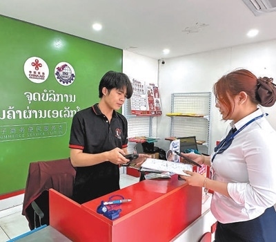 在老撾首都萬象市一處便民服務(wù)點(diǎn),當(dāng)?shù)鼐用袷杖≡陔娚唐脚_選購的商品快遞。本報記者 孫廣勇攝