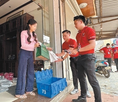 中午時分,記者來到老撾首都萬象市塔鑾附近的一處便民服務(wù)點(diǎn)。摩托車來來往往,不時有當(dāng)?shù)鼐用駚泶耸瞻l(fā)電商商品。工作人員正忙著將收到的商品掃描、稱重、歸類、打包,趕在傍晚送到轉(zhuǎn)運(yùn)中心發(fā)往目的地。