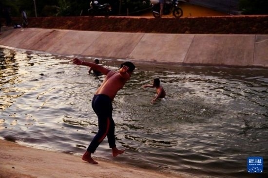 8月9日,當地民眾在17公里水渠中嬉戲。新華社記者 伍岳 攝