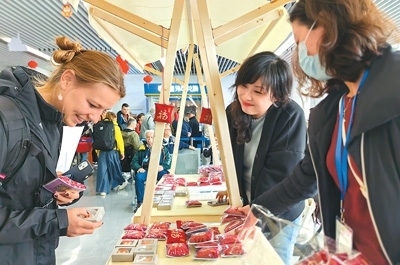 外國游客在“非遺彝繡秀北京”活動(dòng)期間體驗(yàn)佩戴彝繡工藝品。翁奇羽攝(人民視覺)