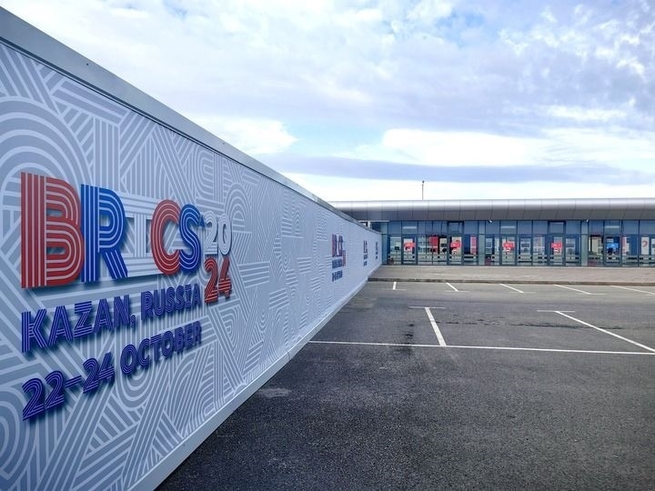 這是2024年10月24日在俄羅斯喀山拍攝的金磚峰會(huì)標(biāo)識(shí)和國(guó)旗。新華社記者 李學(xué)仁 攝