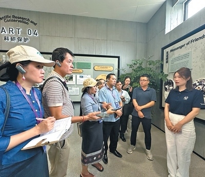 老撾記者在成都大熊貓繁育研究基地對(duì)大熊貓保護(hù)工作進(jìn)行采訪。老撾《人民報(bào)》記者 薩納尼·蓬帕迪攝