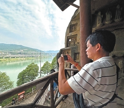 老撾《萬(wàn)象時(shí)報(bào)》記者索薩坤·萬(wàn)喬在參觀廣元千佛崖時(shí),拍攝飛馳而過(guò)的動(dòng)車組列車。老撾國(guó)家通訊社記者 汶娜萊·楠坎娜攝