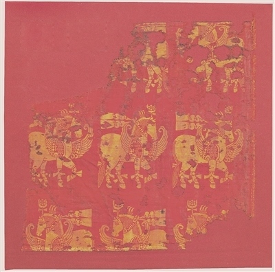“紅地翼馬紋錦”經(jīng)向長52厘米、緯向?qū)?1厘米,以紅色經(jīng)線為地,米白色緯線以斜紋重組織成翼馬圖案,具有明顯的中亞、西亞風(fēng)格。目前紋錦圖案殘存3排翼馬,中間一排3匹馬右行,上排兩匹(殘損嚴(yán)重)和下排3匹均為左行。馬頭戴花狀冠飾,頸系連珠紋帶,連珠紋帶綴有兩條飄帶,從頸后水平狀飄揚。馬胸兩側(cè)生翅,翅上鑲有連珠紋,四足及尾部系縛綢帶結(jié),造型別致,充滿浪漫華貴氣息,是典型的薩珊波斯風(fēng)格。