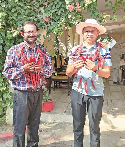 參與中國—巴基斯坦辣椒種植合作項(xiàng)目的中國專家與當(dāng)?shù)丶夹g(shù)員共同慶祝辣椒豐收。本報巴基斯坦分社 瓦卡斯·阿赫邁德攝