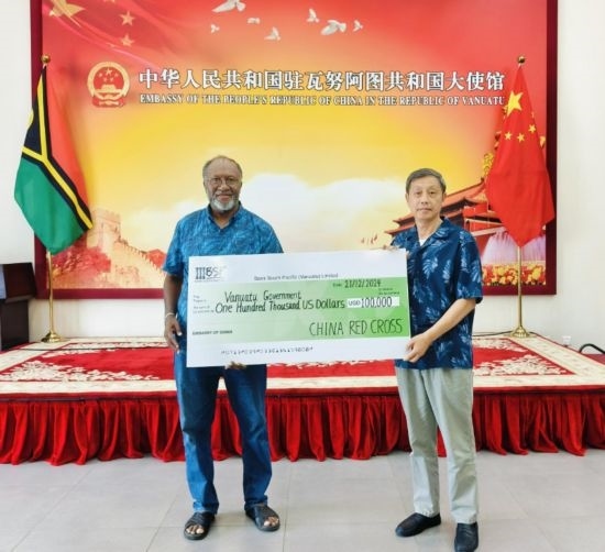 12月21日,中國駐瓦努阿圖大使李名剛(右)向瓦看守政府總理薩爾維轉(zhuǎn)交中國紅十字會(huì)向瓦提供的10萬美元緊急人道主義現(xiàn)匯援助。中國駐瓦努阿圖大使館供圖