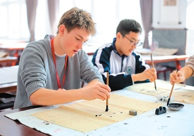 圖為活動(dòng)期間,來自美國得克薩斯州圣史蒂芬圣公會(huì)學(xué)校的學(xué)生查爾斯·錢寧·達(dá)根(左)在河北衡水中學(xué)學(xué)習(xí)書法。
