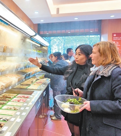 在柏林市中心,一家新開不久的“楊國福麻辣燙”店門口,當?shù)厝思{爾夫和幾個好友推門而入。店內(nèi)熱氣騰騰,空氣中彌漫著濃郁的骨湯香氣。在排隊取餐的人群中,不乏像納爾夫這樣的外國朋友。他們拿起夾子和菜盆,熟練地自選食材(見圖②,本報記者劉赫攝):藕片、菠菜、凍豆腐、寬粉、蝦和牛肉卷……幾分鐘后,一碗香氣四溢的麻辣燙被端上餐桌。