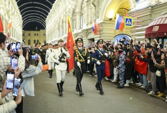 在4月29日和5月3日的夜間彩排中,中國(guó)方隊(duì)隊(duì)列整齊、精神飽滿(mǎn),甫一亮相便引發(fā)轟動(dòng)。眾多俄羅斯民眾、在俄華僑華人和中國(guó)留學(xué)生聚集在紅場(chǎng)附近,爭(zhēng)相觀看。