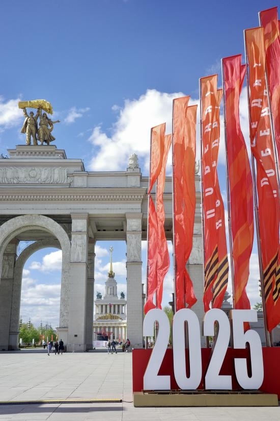 當(dāng)?shù)貢r間5月6日,莫斯科威登漢(國民經(jīng)濟成就展覽館)大門前一側(cè),布置好了2025標(biāo)志和紀(jì)念旗幟。劉少華 攝