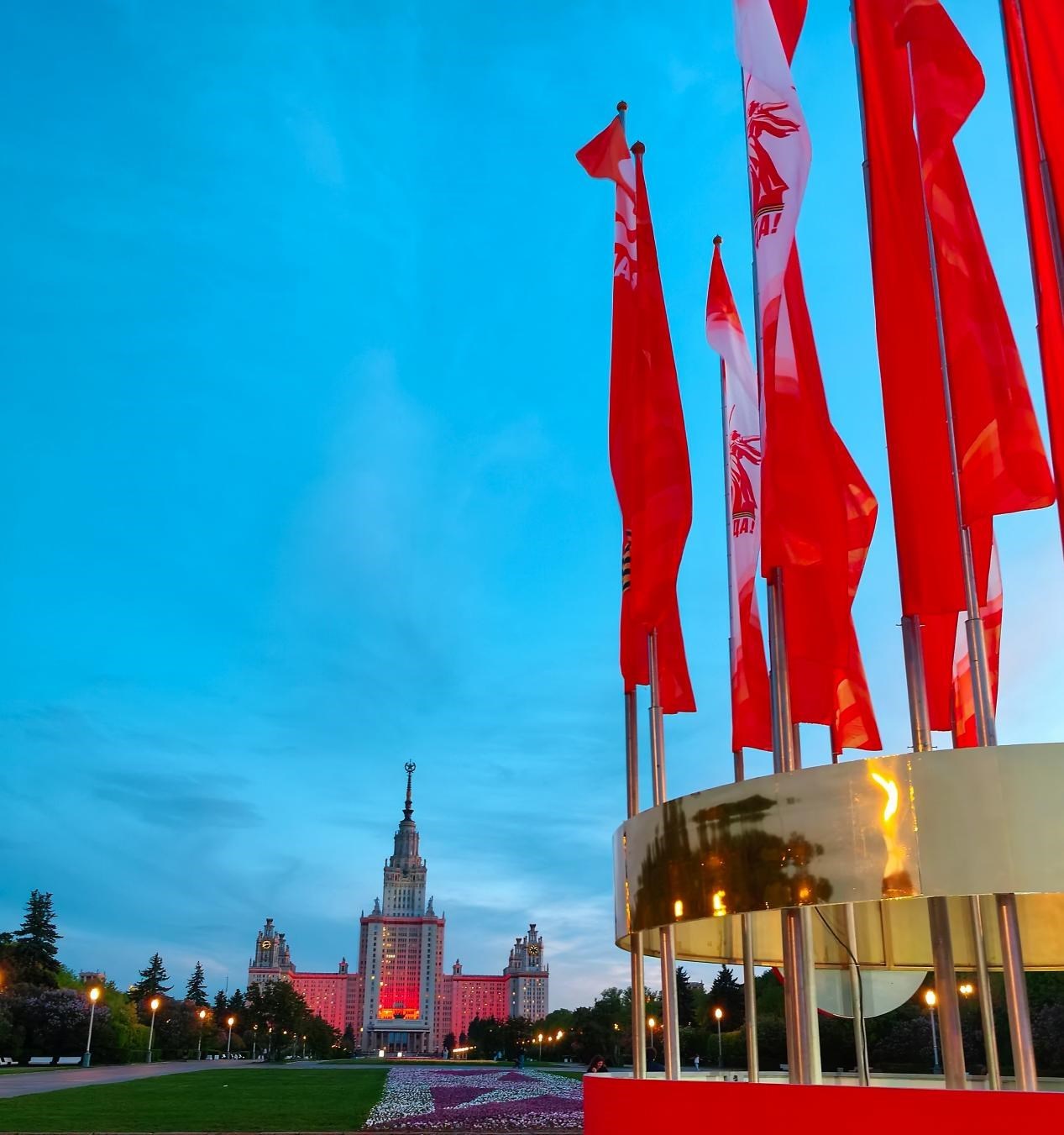 當(dāng)?shù)貢r間5月6日,莫斯科麻雀山,紀(jì)念蘇聯(lián)偉大衛(wèi)國戰(zhàn)爭勝利80周年慶典的旗幟飄揚,與莫斯科國立大學(xué)主樓的燈火遙相輝映。 鄺西曦 攝