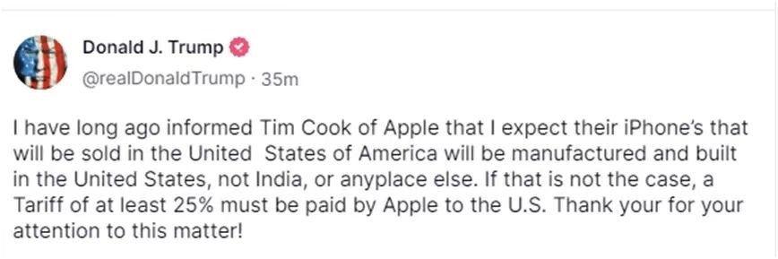 針對蘋果,特朗普說,他“很早之前就告訴過蘋果公司的(首席執(zhí)行官)蒂姆·庫克,我希望他們在美國銷售的蘋果手機(jī)是在美國生產(chǎn)和制造,而不是在印度或者其他什么地方”,“如果不是這樣的話,蘋果公司必須向美國支付至少25%的關(guān)稅”。