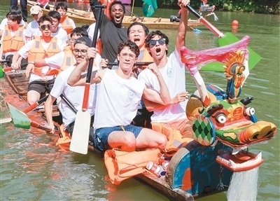 去年,我參加了由杭州余杭區(qū)五常街道組織的龍舟體驗營,親身感受競渡帶來的“速度與激情”。我和同校好友組成隊伍,伴著耳邊觀眾的熱情歡呼揮槳出發(fā),濺起的水花在河道綻放。握槳、入水、拉水、出水、回槳……隨著龍舟劃至終點,我們揮舞校旗、舉槳歡呼。在龍舟運動中,我感受到了奮斗和團結(jié)的力量——不同膚色的人們在同一條水道上并肩奮進,這不正是“同舟共濟”的東方智慧嗎!